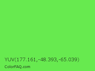 YUV 177.161,-48.393,-65.039 Color is a light green color and the nearest color is Screamin Green #66ff66. Hex code #67ea4f and RGB value is rgb(103,234,79). In RGB color space, this color is composed of 40% red, 92% green, 31% blue, In CMYK color space, this color is composed of 56% cyan, 0% magenta, 66% yellow , 8% black , In HSL color space, this color has a hue angle of 111° , 79% saturation and 61% lightness.