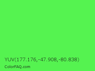 YUV 177.176,-47.908,-80.838 Color is a light green color and the nearest color is Screamin Green #66ff66. Hex code #55f350 and RGB value is rgb(85,243,80). In RGB color space, this color is composed of 33% red, 95% green, 31% blue, In CMYK color space, this color is composed of 65% cyan, 0% magenta, 67% yellow , 5% black , In HSL color space, this color has a hue angle of 118° , 87% saturation and 63% lightness.