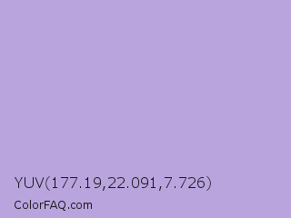 YUV 177.19,22.091,7.726 Color is a light violet color and the nearest color is Light Pastel Purple #b19cd9. Hex code #baa4de and RGB value is rgb(186,164,222). In RGB color space, this color is composed of 73% red, 64% green, 87% blue, In CMYK color space, this color is composed of 16% cyan, 26% magenta, 0% yellow , 13% black , In HSL color space, this color has a hue angle of 263° , 47% saturation and 76% lightness.