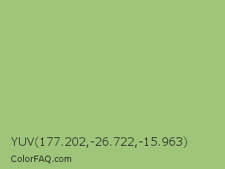 YUV 177.202,-26.722,-15.963 Color is a light green color and the nearest color is Pistachio #93c572. Hex code #9fc57b and RGB value is rgb(159,197,123). In RGB color space, this color is composed of 62% red, 77% green, 48% blue, In CMYK color space, this color is composed of 19% cyan, 0% magenta, 38% yellow , 23% black , In HSL color space, this color has a hue angle of 91° , 39% saturation and 63% lightness.