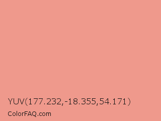 YUV 177.232,-18.355,54.171 Color is a light red color and the nearest color is Tonys Pink #e79f8c. Hex code #ef998c and RGB value is rgb(239,153,140). In RGB color space, this color is composed of 94% red, 60% green, 55% blue, In CMYK color space, this color is composed of 0% cyan, 36% magenta, 41% yellow , 6% black , In HSL color space, this color has a hue angle of 8° , 76% saturation and 74% lightness.