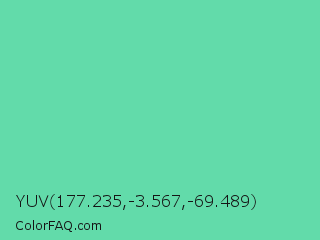 YUV 177.235,-3.567,-69.489 Color is a light green color and the nearest color is Medium Aquamarine #66ddaa. Hex code #62dbaa and RGB value is rgb(98,219,170). In RGB color space, this color is composed of 38% red, 86% green, 67% blue, In CMYK color space, this color is composed of 55% cyan, 0% magenta, 22% yellow , 14% black , In HSL color space, this color has a hue angle of 156° , 63% saturation and 62% lightness.