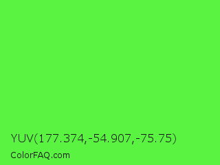 YUV 177.374,-54.907,-75.75 Color is a light green color and the nearest color is Screamin Green #66ff66. Hex code #5bf342 and RGB value is rgb(91,243,66). In RGB color space, this color is composed of 36% red, 95% green, 26% blue, In CMYK color space, this color is composed of 63% cyan, 0% magenta, 73% yellow , 5% black , In HSL color space, this color has a hue angle of 112° , 88% saturation and 61% lightness.
