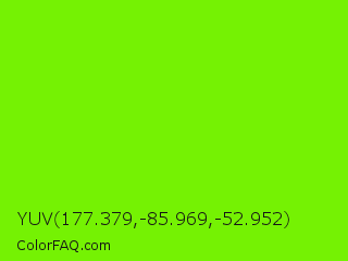 YUV 177.379,-85.969,-52.952 Color is a normal green color and the nearest color is Lawn Green #7cfc00. Hex code #75f203 and RGB value is rgb(117,242,3). In RGB color space, this color is composed of 46% red, 95% green, 1% blue, In CMYK color space, this color is composed of 52% cyan, 0% magenta, 99% yellow , 5% black , In HSL color space, this color has a hue angle of 91° , 98% saturation and 48% lightness.