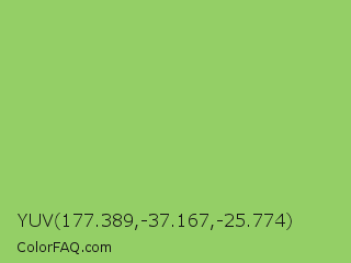YUV 177.389,-37.167,-25.774 Color is a light green color and the nearest color is Pistachio #93c572. Hex code #94cf66 and RGB value is rgb(148,207,102). In RGB color space, this color is composed of 58% red, 81% green, 40% blue, In CMYK color space, this color is composed of 29% cyan, 0% magenta, 51% yellow , 19% black , In HSL color space, this color has a hue angle of 94° , 52% saturation and 61% lightness.