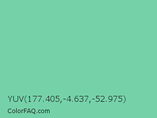 YUV 177.405,-4.637,-52.975 Color is a light green color and the nearest color is Medium Aquamarine #66ddaa. Hex code #75d2a8 and RGB value is rgb(117,210,168). In RGB color space, this color is composed of 46% red, 82% green, 66% blue, In CMYK color space, this color is composed of 44% cyan, 0% magenta, 20% yellow , 18% black , In HSL color space, this color has a hue angle of 153° , 51% saturation and 64% lightness.