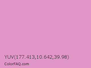 YUV 177.413,10.642,39.98 Color is a light magenta color and the nearest color is Shocking #e292c0. Hex code #df96c7 and RGB value is rgb(223,150,199). In RGB color space, this color is composed of 87% red, 59% green, 78% blue, In CMYK color space, this color is composed of 0% cyan, 33% magenta, 11% yellow , 13% black , In HSL color space, this color has a hue angle of 320° , 53% saturation and 73% lightness.