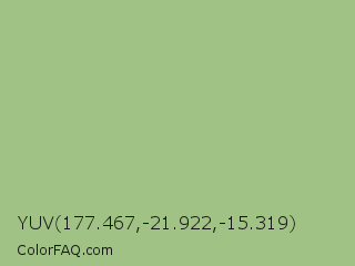 YUV 177.467,-21.922,-15.319 Color is a light green color and the nearest color is Swamp Green #acb78e. Hex code #a0c385 and RGB value is rgb(160,195,133). In RGB color space, this color is composed of 63% red, 76% green, 52% blue, In CMYK color space, this color is composed of 18% cyan, 0% magenta, 32% yellow , 24% black , In HSL color space, this color has a hue angle of 94° , 34% saturation and 64% lightness.