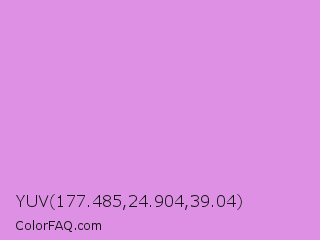YUV 177.485,24.904,39.04 Color is a light magenta color and the nearest color is Bright Lilac #d891ef. Hex code #de91e4 and RGB value is rgb(222,145,228). In RGB color space, this color is composed of 87% red, 57% green, 89% blue, In CMYK color space, this color is composed of 3% cyan, 36% magenta, 0% yellow , 11% black , In HSL color space, this color has a hue angle of 296° , 61% saturation and 73% lightness.
