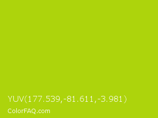 YUV 177.539,-81.611,-3.981 Color is a normal lime color and the nearest color is Vivid Lime Green #a6d608. Hex code #add40c and RGB value is rgb(173,212,12). In RGB color space, this color is composed of 68% red, 83% green, 5% blue, In CMYK color space, this color is composed of 18% cyan, 0% magenta, 94% yellow , 17% black , In HSL color space, this color has a hue angle of 72° , 89% saturation and 44% lightness.