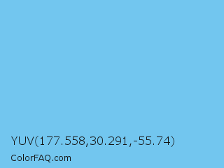 YUV 177.558,30.291,-55.74 Color is a light blue color and the nearest color is Maya Blue #73c2fb. Hex code #72c6ef and RGB value is rgb(114,198,239). In RGB color space, this color is composed of 45% red, 78% green, 94% blue, In CMYK color space, this color is composed of 52% cyan, 17% magenta, 0% yellow , 6% black , In HSL color space, this color has a hue angle of 200° , 80% saturation and 69% lightness.