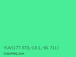 YUV 177.573,-13.1,-91.711 Color is a light green color and the nearest color is Eucalyptus #44d7a8. Hex code #49ec97 and RGB value is rgb(73,236,151). In RGB color space, this color is composed of 29% red, 93% green, 59% blue, In CMYK color space, this color is composed of 69% cyan, 0% magenta, 36% yellow , 7% black , In HSL color space, this color has a hue angle of 149° , 81% saturation and 61% lightness.
