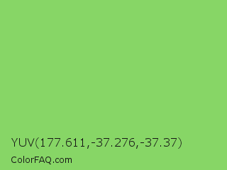YUV 177.611,-37.276,-37.37 Color is a light green color and the nearest color is Pistachio #93c572. Hex code #87d666 and RGB value is rgb(135,214,102). In RGB color space, this color is composed of 53% red, 84% green, 40% blue, In CMYK color space, this color is composed of 37% cyan, 0% magenta, 52% yellow , 16% black , In HSL color space, this color has a hue angle of 102° , 58% saturation and 62% lightness.