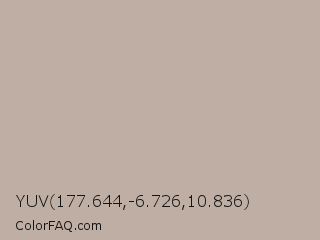 YUV 177.644,-6.726,10.836 Color is a light orange color and the nearest color is Malta #bdb2a1. Hex code #beaea4 and RGB value is rgb(190,174,164). In RGB color space, this color is composed of 75% red, 68% green, 64% blue, In CMYK color space, this color is composed of 0% cyan, 8% magenta, 14% yellow , 25% black , In HSL color space, this color has a hue angle of 23° , 17% saturation and 69% lightness.