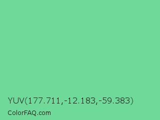 YUV 177.711,-12.183,-59.383 Color is a light green color and the nearest color is Medium Aquamarine #66ddaa. Hex code #6ed999 and RGB value is rgb(110,217,153). In RGB color space, this color is composed of 43% red, 85% green, 60% blue, In CMYK color space, this color is composed of 49% cyan, 0% magenta, 29% yellow , 15% black , In HSL color space, this color has a hue angle of 144° , 58% saturation and 64% lightness.
