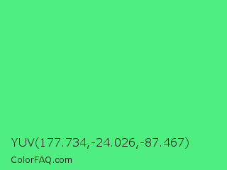 YUV 177.734,-24.026,-87.467 Color is a light green color and the nearest color is Very Light Malachite Green #64e986. Hex code #4eee81 and RGB value is rgb(78,238,129). In RGB color space, this color is composed of 31% red, 93% green, 51% blue, In CMYK color space, this color is composed of 67% cyan, 0% magenta, 46% yellow , 7% black , In HSL color space, this color has a hue angle of 139° , 82% saturation and 62% lightness.