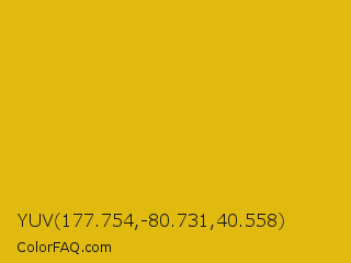 YUV 177.754,-80.731,40.558 Color is a normal yellow color and the nearest color is Gold Tips #deba13. Hex code #e0ba0e and RGB value is rgb(224,186,14). In RGB color space, this color is composed of 88% red, 73% green, 5% blue, In CMYK color space, this color is composed of 0% cyan, 17% magenta, 94% yellow , 12% black , In HSL color space, this color has a hue angle of 49° , 88% saturation and 47% lightness.