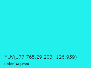YUV 177.765,29.203,-126.959 Color is a normal cyan color and the nearest color is Loeen #15f2fd. Hex code #21f0ed and RGB value is rgb(33,240,237). In RGB color space, this color is composed of 13% red, 94% green, 93% blue, In CMYK color space, this color is composed of 86% cyan, 0% magenta, 1% yellow , 6% black , In HSL color space, this color has a hue angle of 179° , 87% saturation and 54% lightness.