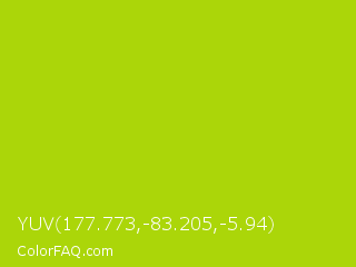 YUV 177.773,-83.205,-5.94 Color is a normal lime color and the nearest color is Vivid Lime Green #a6d608. Hex code #abd609 and RGB value is rgb(171,214,9). In RGB color space, this color is composed of 67% red, 84% green, 4% blue, In CMYK color space, this color is composed of 20% cyan, 0% magenta, 96% yellow , 16% black , In HSL color space, this color has a hue angle of 73° , 92% saturation and 44% lightness.