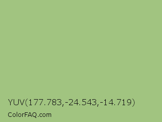 YUV 177.783,-24.543,-14.719 Color is a light green color and the nearest color is Olivine #9ab973. Hex code #a1c480 and RGB value is rgb(161,196,128). In RGB color space, this color is composed of 63% red, 77% green, 50% blue, In CMYK color space, this color is composed of 18% cyan, 0% magenta, 35% yellow , 23% black , In HSL color space, this color has a hue angle of 91° , 37% saturation and 64% lightness.