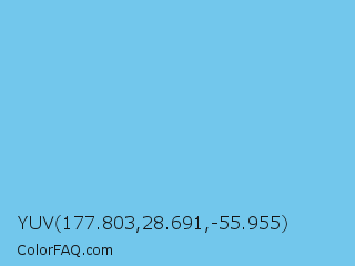 YUV 177.803,28.691,-55.955 Color is a light blue color and the nearest color is Seagull #80ccea. Hex code #72c7ec and RGB value is rgb(114,199,236). In RGB color space, this color is composed of 45% red, 78% green, 93% blue, In CMYK color space, this color is composed of 52% cyan, 16% magenta, 0% yellow , 7% black , In HSL color space, this color has a hue angle of 198° , 76% saturation and 69% lightness.