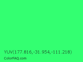 YUV 177.816,-31.954,-111.218 Color is a normal green color and the nearest color is UFO Green #3cd070. Hex code #33ff71 and RGB value is rgb(51,255,113). In RGB color space, this color is composed of 20% red, 100% green, 44% blue, In CMYK color space, this color is composed of 80% cyan, 0% magenta, 56% yellow , 0% black , In HSL color space, this color has a hue angle of 138° , 100% saturation and 60% lightness.
