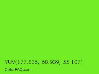YUV 177.836,-68.939,-55.107 Color is a normal green color and the nearest color is Spring Frost #87ff2a. Hex code #73ed26 and RGB value is rgb(115,237,38). In RGB color space, this color is composed of 45% red, 93% green, 15% blue, In CMYK color space, this color is composed of 51% cyan, 0% magenta, 84% yellow , 7% black , In HSL color space, this color has a hue angle of 97° , 85% saturation and 54% lightness.