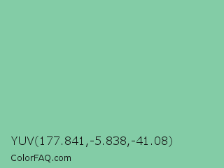 YUV 177.841,-5.838,-41.08 Color is a light green color and the nearest color is Eton Blue #96c8a2. Hex code #83cca6 and RGB value is rgb(131,204,166). In RGB color space, this color is composed of 51% red, 80% green, 65% blue, In CMYK color space, this color is composed of 36% cyan, 0% magenta, 19% yellow , 20% black , In HSL color space, this color has a hue angle of 149° , 42% saturation and 66% lightness.