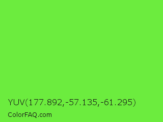 YUV 177.892,-57.135,-61.295 Color is a normal green color and the nearest color is Kiwi #8ee53f. Hex code #6cec3e and RGB value is rgb(108,236,62). In RGB color space, this color is composed of 42% red, 93% green, 24% blue, In CMYK color space, this color is composed of 54% cyan, 0% magenta, 74% yellow , 7% black , In HSL color space, this color has a hue angle of 104° , 82% saturation and 58% lightness.