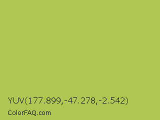 YUV 177.899,-47.278,-2.542 Color is a normal lime color and the nearest color is Celery #b8c25d. Hex code #afc652 and RGB value is rgb(175,198,82). In RGB color space, this color is composed of 69% red, 78% green, 32% blue, In CMYK color space, this color is composed of 12% cyan, 0% magenta, 59% yellow , 22% black , In HSL color space, this color has a hue angle of 72° , 50% saturation and 55% lightness.