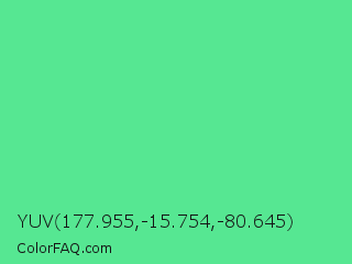 YUV 177.955,-15.754,-80.645 Color is a light green color and the nearest color is Very Light Malachite Green #64e986. Hex code #56e792 and RGB value is rgb(86,231,146). In RGB color space, this color is composed of 34% red, 91% green, 57% blue, In CMYK color space, this color is composed of 63% cyan, 0% magenta, 37% yellow , 9% black , In HSL color space, this color has a hue angle of 145° , 75% saturation and 62% lightness.