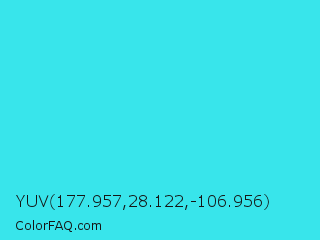 YUV 177.957,28.122,-106.956 Color is a normal cyan color and the nearest color is Turquoise #40e0d0. Hex code #38e5eb and RGB value is rgb(56,229,235). In RGB color space, this color is composed of 22% red, 90% green, 92% blue, In CMYK color space, this color is composed of 76% cyan, 3% magenta, 0% yellow , 8% black , In HSL color space, this color has a hue angle of 182° , 82% saturation and 57% lightness.