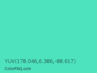 YUV 178.046,6.386,-88.617 Color is a normal cyan color and the nearest color is Turquoise #40e0d0. Hex code #4de3bf and RGB value is rgb(77,227,191). In RGB color space, this color is composed of 30% red, 89% green, 75% blue, In CMYK color space, this color is composed of 66% cyan, 0% magenta, 16% yellow , 11% black , In HSL color space, this color has a hue angle of 166° , 73% saturation and 60% lightness.
