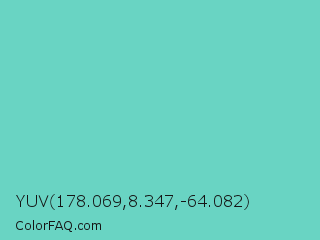 YUV 178.069,8.347,-64.082 Color is a light cyan color and the nearest color is Downy #6fd0c5. Hex code #69d4c3 and RGB value is rgb(105,212,195). In RGB color space, this color is composed of 41% red, 83% green, 76% blue, In CMYK color space, this color is composed of 50% cyan, 0% magenta, 8% yellow , 17% black , In HSL color space, this color has a hue angle of 170° , 55% saturation and 62% lightness.