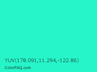YUV 178.091,11.294,-122.86 Color is a normal cyan color and the nearest color is Turquoise PWG #30d5c8. Hex code #26f5c9 and RGB value is rgb(38,245,201). In RGB color space, this color is composed of 15% red, 96% green, 79% blue, In CMYK color space, this color is composed of 84% cyan, 0% magenta, 18% yellow , 4% black , In HSL color space, this color has a hue angle of 167° , 91% saturation and 55% lightness.