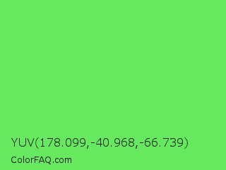 YUV 178.099,-40.968,-66.739 Color is a light green color and the nearest color is Screamin Green #66ff66. Hex code #66e95f and RGB value is rgb(102,233,95). In RGB color space, this color is composed of 40% red, 91% green, 37% blue, In CMYK color space, this color is composed of 56% cyan, 0% magenta, 59% yellow , 9% black , In HSL color space, this color has a hue angle of 117° , 76% saturation and 64% lightness.