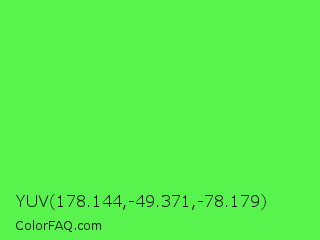 YUV 178.144,-49.371,-78.179 Color is a light green color and the nearest color is Screamin Green #66ff66. Hex code #59f34e and RGB value is rgb(89,243,78). In RGB color space, this color is composed of 35% red, 95% green, 31% blue, In CMYK color space, this color is composed of 63% cyan, 0% magenta, 68% yellow , 5% black , In HSL color space, this color has a hue angle of 116° , 87% saturation and 63% lightness.