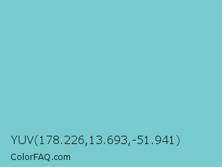 YUV 178.226,13.693,-51.941 Color is a light cyan color and the nearest color is Downy #6fd0c5. Hex code #77cbce and RGB value is rgb(119,203,206). In RGB color space, this color is composed of 47% red, 80% green, 81% blue, In CMYK color space, this color is composed of 42% cyan, 1% magenta, 0% yellow , 19% black , In HSL color space, this color has a hue angle of 182° , 47% saturation and 64% lightness.