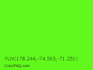 YUV 178.244,-74.563,-71.251 Color is a normal green color and the nearest color is Bright Green #66ff00. Hex code #61f91b and RGB value is rgb(97,249,27). In RGB color space, this color is composed of 38% red, 98% green, 11% blue, In CMYK color space, this color is composed of 61% cyan, 0% magenta, 89% yellow , 2% black , In HSL color space, this color has a hue angle of 101° , 95% saturation and 54% lightness.