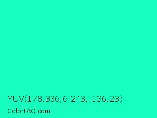 YUV 178.336,6.243,-136.23 Color is a normal green color and the nearest color is Bright Turquoise #08e8de. Hex code #17ffbf and RGB value is rgb(23,255,191). In RGB color space, this color is composed of 9% red, 100% green, 75% blue, In CMYK color space, this color is composed of 91% cyan, 0% magenta, 25% yellow , 0% black , In HSL color space, this color has a hue angle of 163° , 100% saturation and 55% lightness.