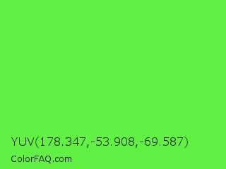 YUV 178.347,-53.908,-69.587 Color is a light green color and the nearest color is Screamin Green #66ff66. Hex code #63f045 and RGB value is rgb(99,240,69). In RGB color space, this color is composed of 39% red, 94% green, 27% blue, In CMYK color space, this color is composed of 59% cyan, 0% magenta, 71% yellow , 6% black , In HSL color space, this color has a hue angle of 109° , 85% saturation and 61% lightness.