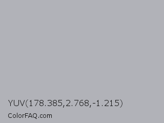 YUV 178.385,2.768,-1.215 Color is a light blue color and the nearest color is Bombay #afb1b8. Hex code #b1b2b8 and RGB value is rgb(177,178,184). In RGB color space, this color is composed of 69% red, 70% green, 72% blue, In CMYK color space, this color is composed of 4% cyan, 3% magenta, 0% yellow , 28% black , In HSL color space, this color has a hue angle of 231° , 5% saturation and 71% lightness.