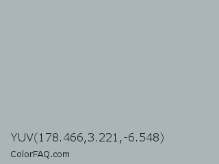 YUV 178.466,3.221,-6.548 Color is a light blue color and the nearest color is Bombay #afb1b8. Hex code #abb5b9 and RGB value is rgb(171,181,185). In RGB color space, this color is composed of 67% red, 71% green, 73% blue, In CMYK color space, this color is composed of 8% cyan, 2% magenta, 0% yellow , 27% black , In HSL color space, this color has a hue angle of 197° , 9% saturation and 70% lightness.