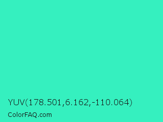 YUV 178.501,6.162,-110.064 Color is a normal cyan color and the nearest color is Turquoise #40e0d0. Hex code #35f0bf and RGB value is rgb(53,240,191). In RGB color space, this color is composed of 21% red, 94% green, 75% blue, In CMYK color space, this color is composed of 78% cyan, 0% magenta, 20% yellow , 6% black , In HSL color space, this color has a hue angle of 164° , 86% saturation and 57% lightness.