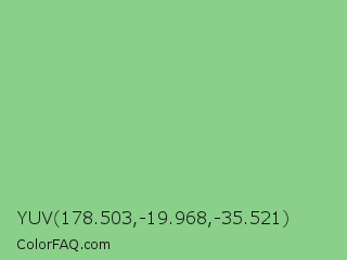 YUV 178.503,-19.968,-35.521 Color is a light green color and the nearest color is De York #7ac488. Hex code #8acf8a and RGB value is rgb(138,207,138). In RGB color space, this color is composed of 54% red, 81% green, 54% blue, In CMYK color space, this color is composed of 33% cyan, 0% magenta, 33% yellow , 19% black , In HSL color space, this color has a hue angle of 120° , 42% saturation and 68% lightness.