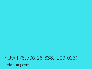 YUV 178.506,28.838,-103.053 Color is a normal cyan color and the nearest color is Turquoise #40e0d0. Hex code #3de3ed and RGB value is rgb(61,227,237). In RGB color space, this color is composed of 24% red, 89% green, 93% blue, In CMYK color space, this color is composed of 74% cyan, 4% magenta, 0% yellow , 7% black , In HSL color space, this color has a hue angle of 183° , 83% saturation and 58% lightness.