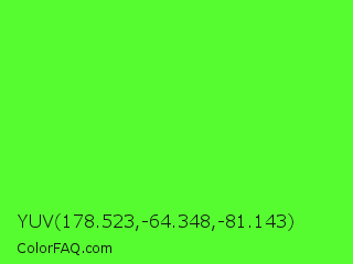 YUV 178.523,-64.348,-81.143 Color is a normal green color and the nearest color is Neon Green #39ff14. Hex code #56fb30 and RGB value is rgb(86,251,48). In RGB color space, this color is composed of 34% red, 98% green, 19% blue, In CMYK color space, this color is composed of 66% cyan, 0% magenta, 81% yellow , 2% black , In HSL color space, this color has a hue angle of 109° , 96% saturation and 59% lightness.