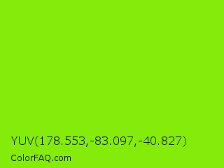 YUV 178.553,-83.097,-40.827 Color is a normal green color and the nearest color is Alien Armpit #84de02. Hex code #84eb0a and RGB value is rgb(132,235,10). In RGB color space, this color is composed of 52% red, 92% green, 4% blue, In CMYK color space, this color is composed of 44% cyan, 0% magenta, 96% yellow , 8% black , In HSL color space, this color has a hue angle of 87° , 92% saturation and 48% lightness.