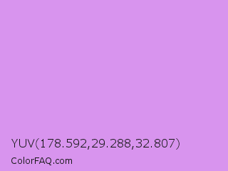 YUV 178.592,29.288,32.807 Color is a light purple color and the nearest color is Bright Lilac #d891ef. Hex code #d894ee and RGB value is rgb(216,148,238). In RGB color space, this color is composed of 85% red, 58% green, 93% blue, In CMYK color space, this color is composed of 9% cyan, 38% magenta, 0% yellow , 7% black , In HSL color space, this color has a hue angle of 285° , 73% saturation and 76% lightness.