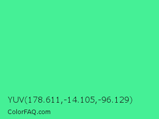 YUV 178.611,-14.105,-96.129 Color is a light green color and the nearest color is Eucalyptus #44d7a8. Hex code #45f096 and RGB value is rgb(69,240,150). In RGB color space, this color is composed of 27% red, 94% green, 59% blue, In CMYK color space, this color is composed of 71% cyan, 0% magenta, 38% yellow , 6% black , In HSL color space, this color has a hue angle of 148° , 85% saturation and 61% lightness.